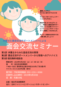 面会交流セミナーを開催します。 2019年5月25日(土)午後2時から午後4時まで 旭合同法律事務所
